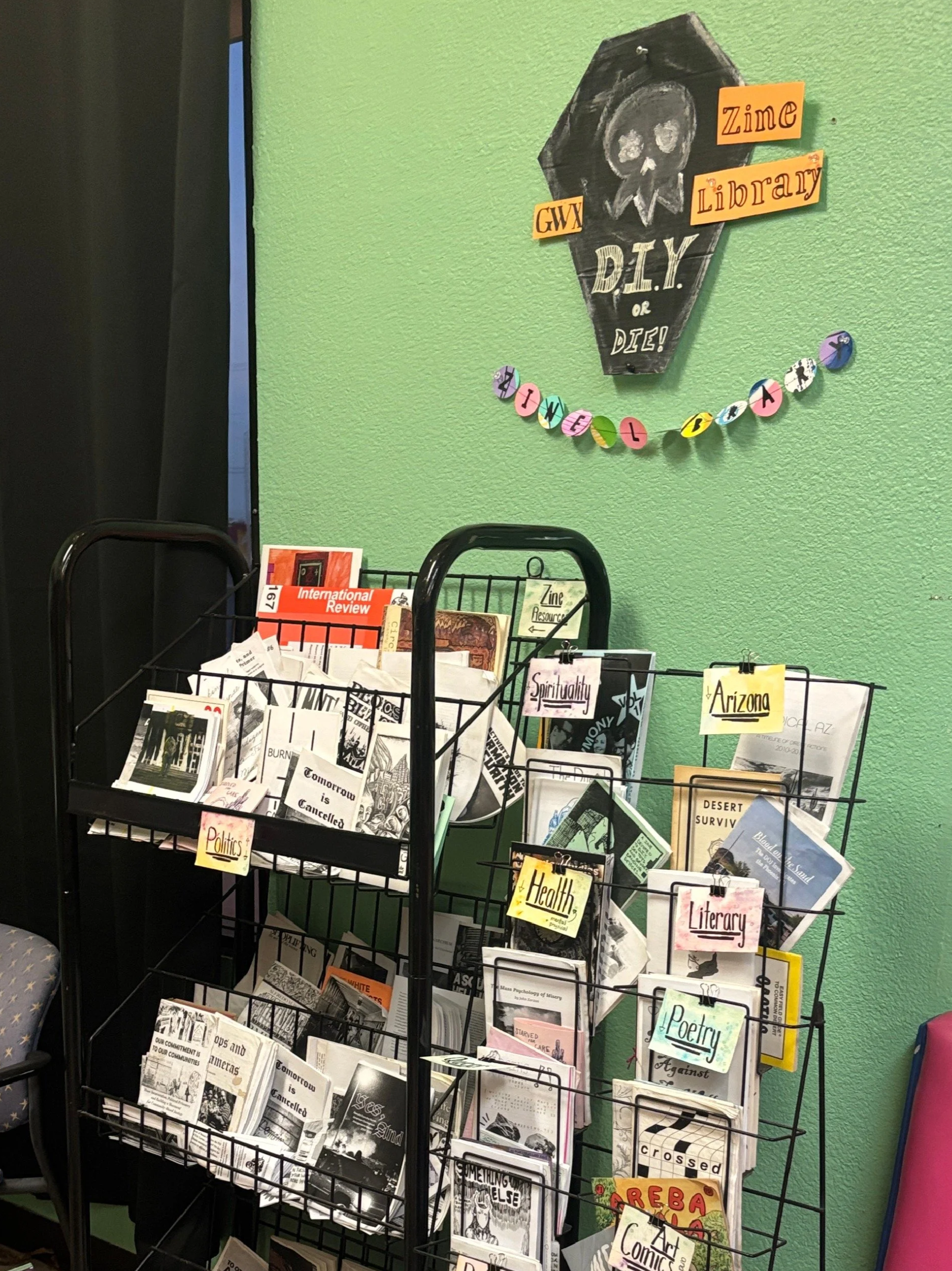 Our lobby features over 500 unique zines, a project started by the generous donation of zines by Tucson Zine Fest and continued with their support and the support of our local community of zinesters