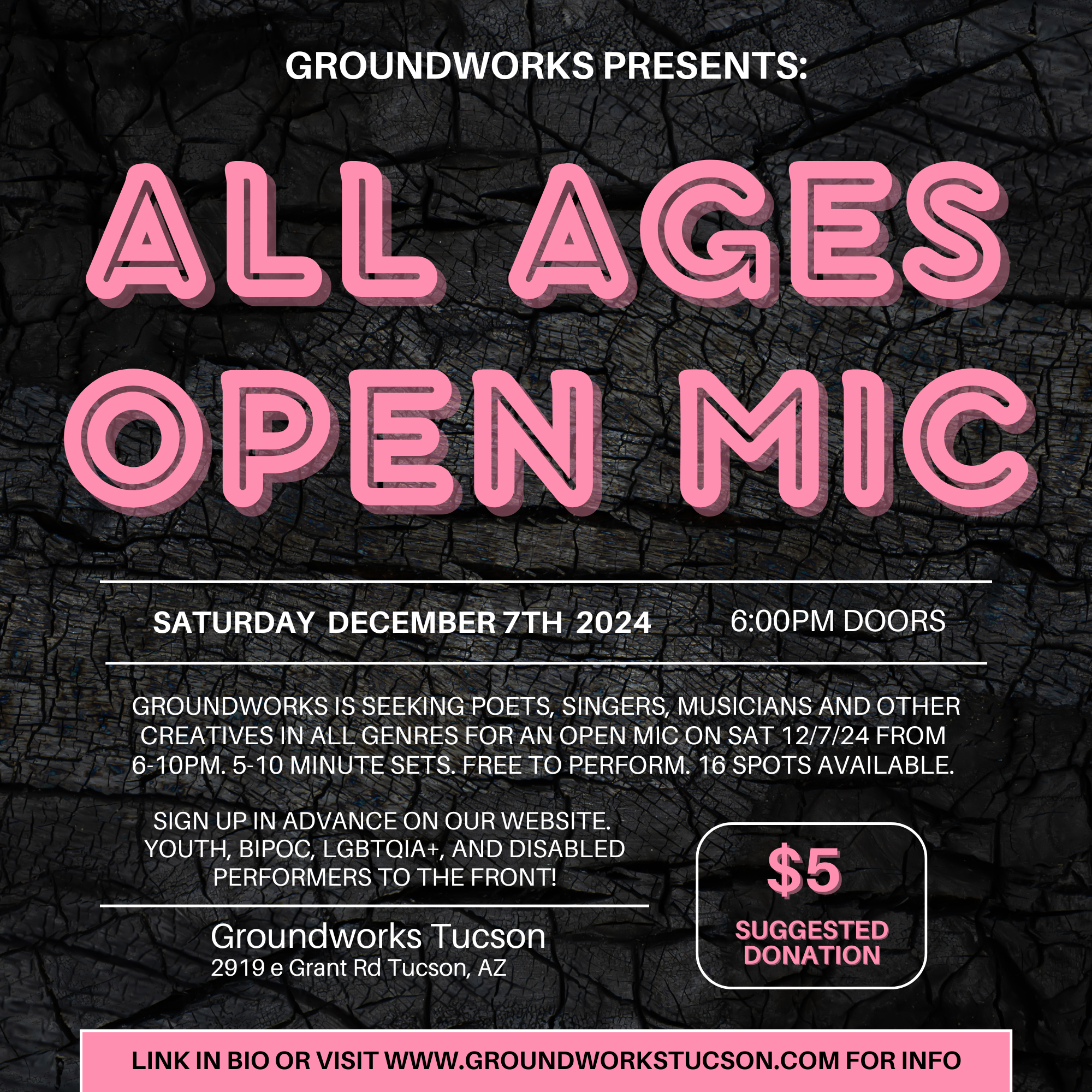 "Groundworks is seeking poets, singers, musicians and other creatives in all genres for an open mic on Sat 12/7/24 from 6-10pm.