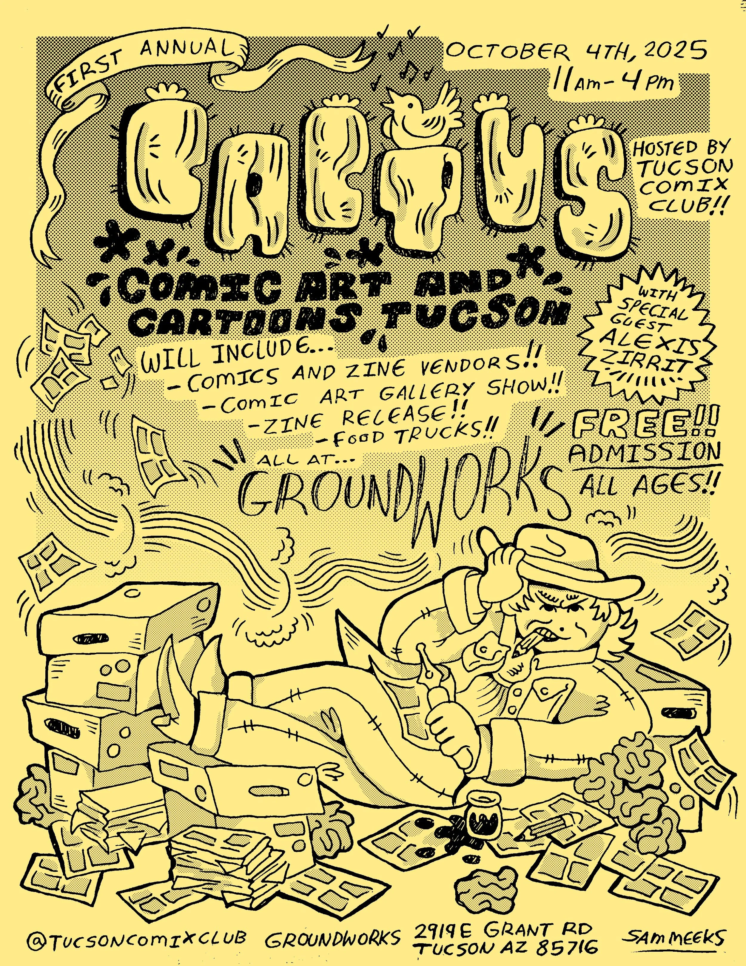 Presenting CACTUS (Comic Art and Cartoons Tucson), a brand new free-to-attend comics festival that aims to unify and crystallize a burgeoning Southwestern scene of independent cartoonists and creators. CACTUS’s mission is to showcase comics to the local community that are outside the purview of corporate IP or market trends, instead focusing on artists who make work that is creatively adventurous, personal, and that offer unique perspectives not found in traditional channels. Newcomers and die-hards alike are invited to meet over 30+ regional cartoonists and experience their handcrafted work firsthand for themselves.